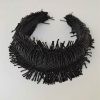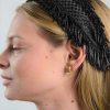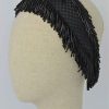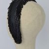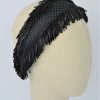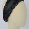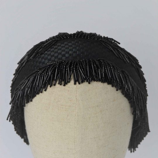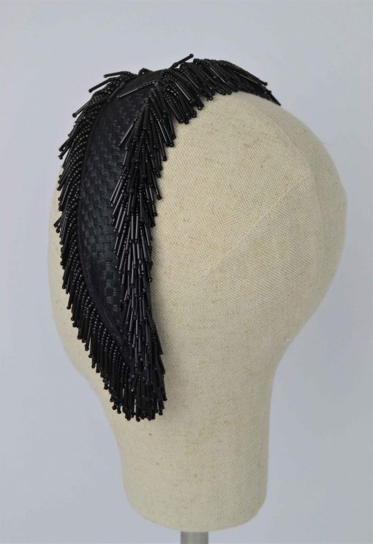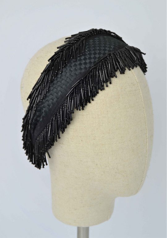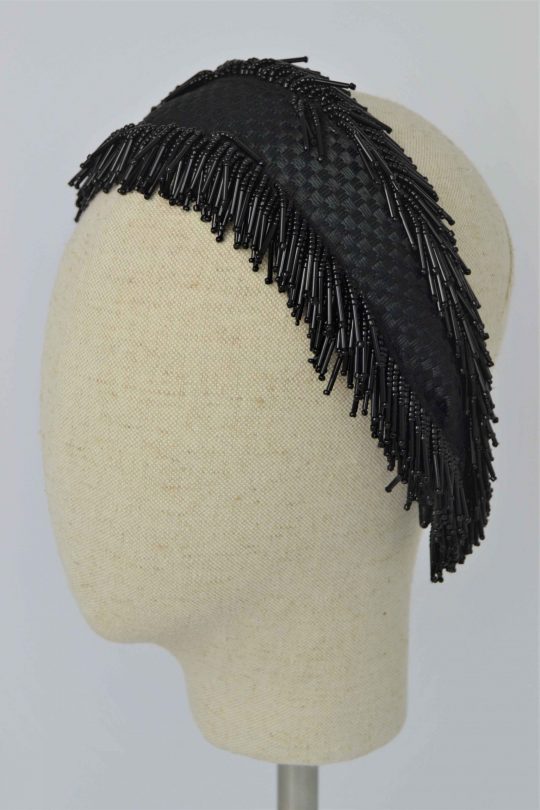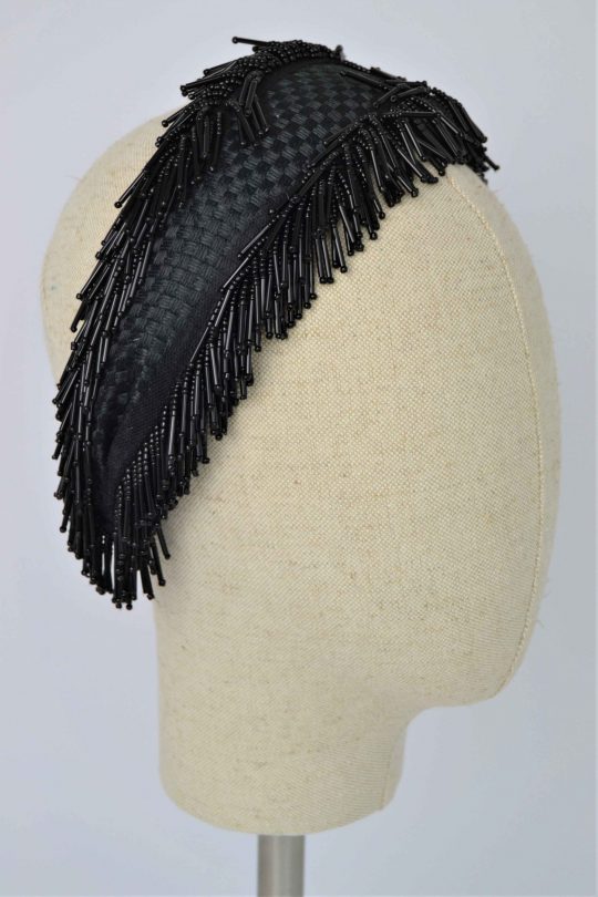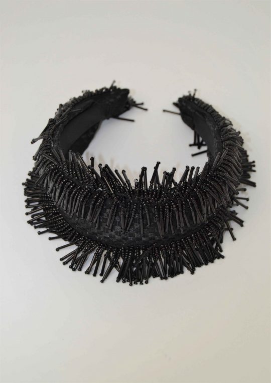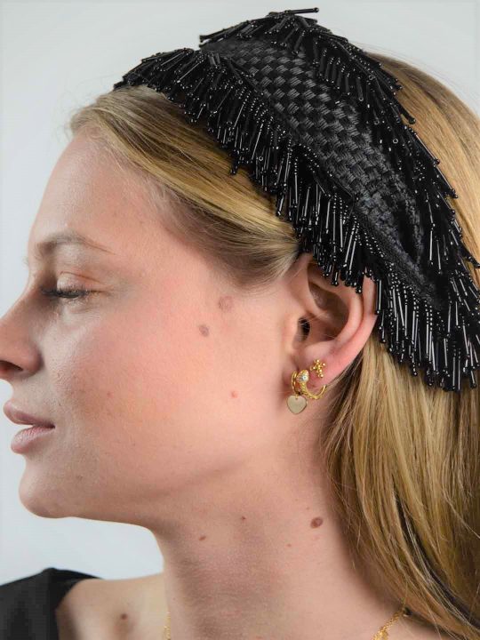Diadema ancha de tela negra con dibujo de damero rematada con flecos de canutillo y piedras negras. Por su diseño, es una diadema con un poco de movimiento por los flecos. No pesa. Muy favorecedora y especial.