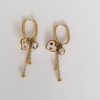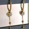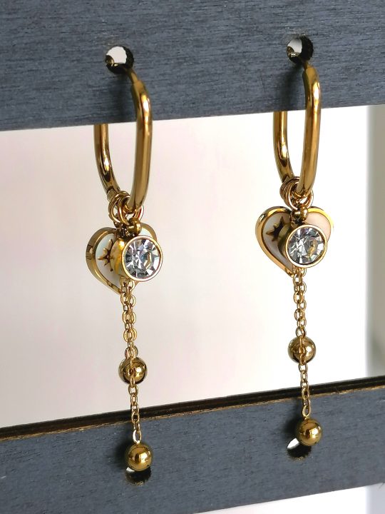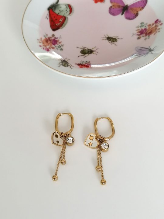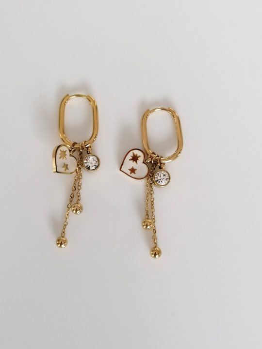 Pendientes aro rectangular con bordes soft y charms colgantes de corazón esmaltado en blanco, cadenas con bolitas y circonita. Pendientes con movimiento, ideal con recogidos deshechos.